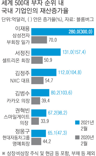 2021년 국내 기업인의 재산 증가율이다. 1조라는 돈이 얼마나 클까? 서민들의 정서로는 억이니 조라는 돈은 감이 잘 잡히지 않는다. 1조원은 1만원 짜리 지폐가 1억장이다. 1조원을 차에 실으려면 5t 트럭 22대가 필요하다고 한다. 가로로 이어 놓는다면 서울-부산 경부고속도로를 열아홉 번 왕복할 수 있는 금액이고, 차곡차곡 쌓는다면 백두산(2744m)의 4배, 에베레스트(8848m)의 1.26배 높이에 이르는 엄청난 금액이다.