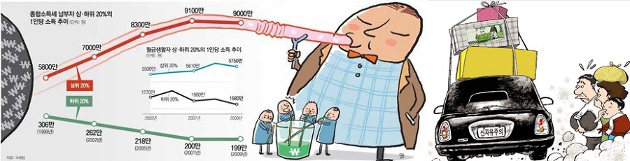 사회 양극화가 한계상황으로 치닫고 있다. 국세청의 ‘2012년 배당소득·이자소득 100분위 자료’를 보면 전체 11조3000여억원의 주식 배당소득 가운데 상위 1%가 가져가는 몫이 72.1%다. 이자소득의 경우 전체 24조9000억원의 44.8%를 상위 1%가 가져갔고, 상위 10%의 몫은 90.6%다. 배당과 이자소득의 원천은 주식과 예금 등 금융자산이다. 금융자산이 상위 10%의 고소득층에 몰려 있다. 금융자산 뿐만 아니다. 90대 10의 사회를 말한다. 우리나라의 4대그룹이 나라 전체 경제를 지배하고 있고, 20%의 국민이 80%의 부를 소유하고 있다. 개인간의 격차는 물론 대기업과 중소기업간의 양극화 그리고 지역별 소득별 양극화는 이제 대물림으로 이어지고 그런 현상이 고착화되고 있다.