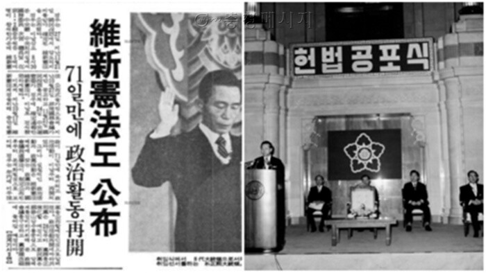 1972년 12월 27일 제 7차 개헌헌법을 유신헌법이라고 한다. ‘낡은 제도를 고쳐 새롭게 한다’는 뜻의 유신이란 한국 헌정사상 7차로 개정된 제4공화국의 헌법이다. ‘평화적 통일지향·한국적 민주주의의 토착화’를 표방한 이 유신헌법 안이 개헌반대 발언이 완전히 봉쇄된 가운데 비상국무회의에서 확정, 국민투표에 회부돼 투표율 91.9%에 91.5% 찬성으로 의결·공고되어 대통령 취임일인 12월 27일 공포·시행되었다.
