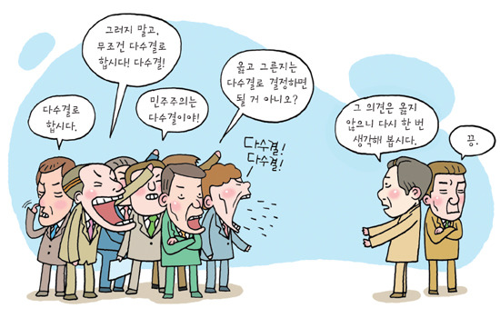 민주주의는 결과보다 과정이 중요하다. 다수결을 내세워 소수의 의견이 무시되는 민주주의는 진정한 의미의 민주주의가 아니다. '다수결이란 최선이 아니다.' 대표성을 이해하지 못하는 대표가 행사하는 권리는 권리가 아니라 폭력이다. 자유라는 인류사회의 보편적인 가치는 전통이나 애교심의 차원을 뛰어넘는 진리다. 이기적인 안목으로 결정한 그 어떤 합의도 민주주의의 적이다.