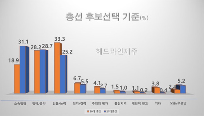 '정당'을 기준으로 후보자를 뽑을 경우, 어느 정당 소속인가를 가장 먼저 보고 '후보자' 기준은 후보자의 자질이나 경력, 참신성, 외모.말투.태도, 도덕성 등을 우선적으로 평가해 투표할 후보에게 투표를, 정책이나 공약을 보고 선택할 경우에는 후보자의 정책과 공약을 보고 후보자를 뽑겠다는 것입니다. 그밖에도 TV토론이나 언론에 노출되는 선거관련 뉴스나 논평.사설, 여론조사 결과 등을 보고 후보자를 선택하는 경우도 있다는 연구결과입니다. 당신은 어떤 기준으로 권리를 행사하시겠습니까?