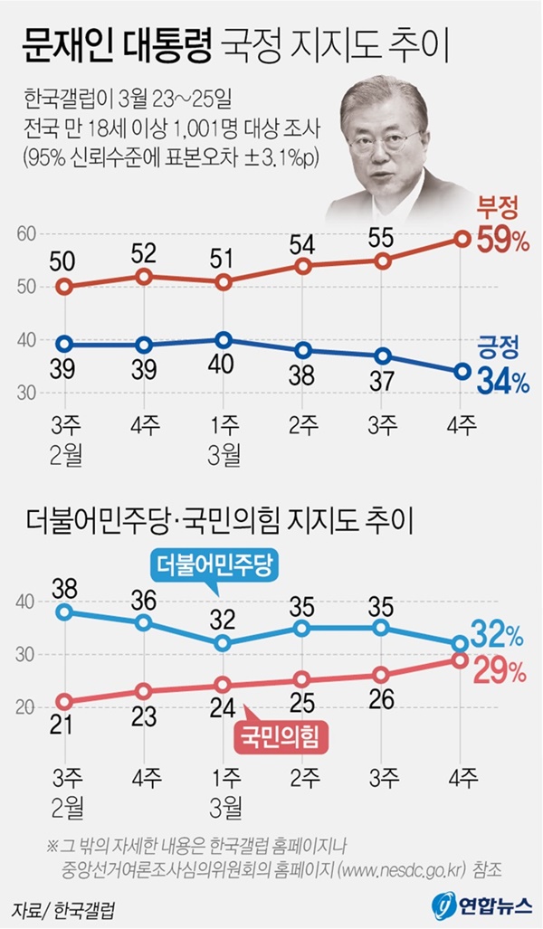 26일 한국갤럽 발표에 따르면 문재인대통령의 직무수행에 대한 평가를 '잘하고 있다'는 34%, '잘못하고 있다'는 59%로 각각 집계됐다. 잘못하고 있다는 이유로는 부동산 정책(34%)이 1위였고, 경제·민생 해결 부족(8%), 공정하지 못함·내로남불(6%) 등이었다. 한국갤럽이 문 대통령 임기 시작 직후인 2017년 5월 실시한 첫 국정 운영 지지율 조사에서는 긍정 평가가 84%, 부정 평가는 7%였다. 85%라는 고공행진을 하던 지지율이 35%로 곤두박질을 친 이유가 무엇일까?