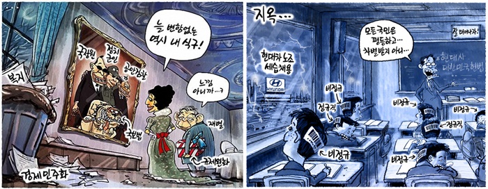 인간으로서의 존엄과 행복추구가 목표인 민주주의와 이윤의 극대화가 목적인 자본이 공존하는 사회... 두가치가 충돌하면 어떤 가치가 우선인가? 당연히 민주주의의 기본이념인 ’인간의 존엄성‘이 우선적인 가치여야 하지만 인간의 욕망과 생존을 위한 자본주의 앞에서는 민주주의 이념은 뒷전이 된다. ‘1907만3438명의 근로자 중 산업재해자 수 10만2305명, 산재사망자수 2,142명’ 하루에 6명의 노동자가 산재사고로 죽어가고 있는 현실을 두고 인간의 존엄성을 말할 수 있는가? ’기업하기 좋은 나라‘라는 기업유치를 위한 지자체가 내건 플래카드는 무엇을 말하는가?