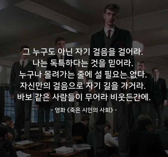 ‘죽은 시인의 사회’의 키팅 선생은 학생들에게 ‘카르페 디엠(Carpe diem)’이라고 가르친다. 숨조차 제대로 쉬기 어려운 형식주의 교육, 거기다 격식과 통제로 권력과 자본이 원하는 인간을 만들겠다는 기득권 세력을 향해 던진 메시지 ‘카르페 디엠!’ 명문대학이 만든 폭력에 대한 도전장, 키엠선생은 ‘현재 이 순간’을 빼앗는 교육이 왜 나쁜지를 학생들이 깨어나게 한다. 보장할 수 없는 수많은 내일을 위해 모든 오늘을 포기하라는 교육은 교육이 아니다. 정형화된 인간을 길러내고 보장 못 하는 내일을 위해 모든 오늘을 포기하라고 가르치는 것은 교육이 아니라 폭력이요, 순치다. 시험문제를 풀이해 주는 것을 교육이라고 알고 있는 교사들, 그들은 교육을 하고 있다고 믿을까?