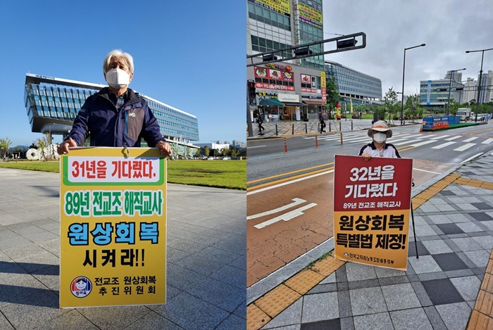 전교조 해직교사들이 교육부나 시도교육청 앞에서 1인시위를 하고 있다. 벌써 1년이 가까워지고 있다. 지나가는 사람들은 백이 된 교사가 ‘32년이 지났다 국가폭력으로 해직시킨 ㄱ전교조 교사를 원상회복시켜라’는 피켇을 들고 서 있는 그들을 보고 뭐라고 생각할까? 89년 전교조교 출범 당시의 모습을 직접 보지 못한 세대들는 ‘저 노인이 왜 저러고 있을까?’, ‘교사였던 모양인데... 쫓겨나 복직을 못한 모양이지...?’ 아니면 ‘불쌍하다’고 생각할까? 출근길에 서서 1인시위를 하는 모습을 보고 ‘나와는 아무런 상관이 없는 일....’이라고 생각할까?