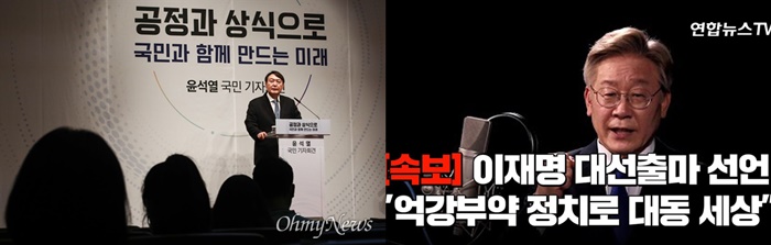 지난 6월 19일 윤석렬 전 검찰총장은 '윤봉길 의사 기념관'에서 대선 출마 선언을 하면서 ‘자유’니 ‘자유민주주의’를 지키겠다는 말을 무려 22차례나 했다. 반면 지난 1일 출마를 선언한 이재명 경기지사는 “특권과 반칙에 기반한 강자의 욕망을 절제시키고 약자의 삶을 보듬는 ‘억강부약(抑强扶弱)’ 정치로 모두 함께 잘 사는 대동세상을 향해가야 한다”고 했다. 이어서 그는 소셜미디어(SNS)로 공개된 출마 선언 영상에서 대한민국 시대정신을 ‘공정성 확보’라고 선언하고 “우리가 저성장으로 고통받은 것은 불공정과 불평등 때문”이라면서 “역사적으로 공정한 나라는 흥했고 불공정한 나라는 망했다”고 했다.
