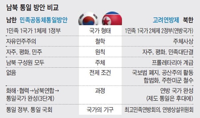34년이나 되는 늙은 헌법을 개헌하자고 해도 수구언론을 비럿해 국민의힘같은 수구 정당이 반대하는데, ‘남북 간의 합의에 따라 법적・제도적 장치가 체계화되어 남북연합 기구들이 창설・운영’하는 남북연합단계가 가능하겠는가? 이러한 단계를 거치면 남북 의회 대표들이 마련한 통일헌법에 따른 민주적 선거에 의해 통일정부, 통일국회를 구성하고 두 체제의 기구와 제도를 통합’한 ‘1민족 1국가의 단일국가’를 구성한다는 것은 뜬구름 잡는 얘기다. 이런 통일방으로 분단을 걷어내고 통일을 하자는 통일방안은 통일을 하지 말자는 주장이나 무엇인 다른가?