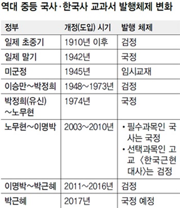 교과서가 발행된 것은 1895년 이다. 교과서는 발행초부토 검정교과서제도였으나 1972년 10월 유신체제가 들어선 뒤, 이듬해인 1973년 국정제로 바뀌어 1974년 국정 국사 교과서로 배우게 됐다. 국정 교과서 폐해에 대한 지적이 끊이지 않았고, 결국 2007년 다시 검인정 체제로 바뀌었다. 교과서 명칭도 "국사"에서 "한국사"로 바뀌었다. 그후 2013년~2010 노무현 이명박정권 시절에는 필수교과인 국사는 국정제로, 선택과목인 한국사는 검인정제가 된다. 2011~2016년 이명박박근혜정권 시절에는 다시 검정제 교과서로 배우다가 박근혜정부시절, 국정제로 박근혜정부가 무너지면서 검인정제로 바뀐다.