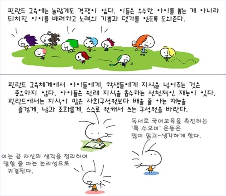 "체육시간 달리기 외에는 '경쟁'이란 말을 들은 적이 없다"는 핀란드 교육. 성적표라는 것을 "받아보기는커녕 들어본 적도 없다."는 핀란드는 도대체 어떻게 교육을 하고 있는 것일까? 그런 핀란드가 ‘국제학력평가(PISA) 1위, 세계경제포럼 성장 경쟁력지수 1위, 청렴도 1위....... 라니 믿어지지가 않는다. 이런 얘기는 컴퓨터를 끄고 켤 수만 있는 사람이라면 인터넷에서 어렵지 않게 찾아 볼 수 있다.