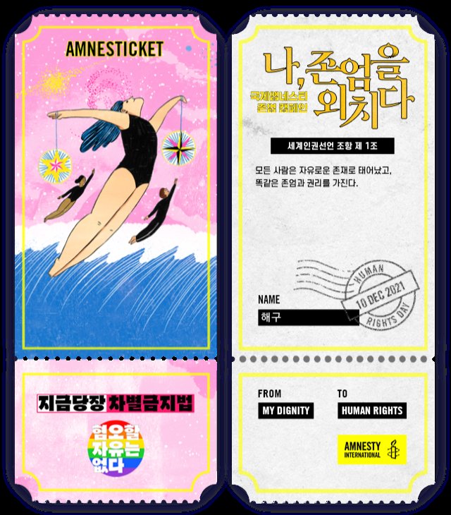 존엄성을 해치는 위협으로부터 모든 사람의 인권 보장을 위해 활동하는 엠네스티의 인권 존엄캠페인이다. 엠네스티는 전 세계 국가들이 한곳에 모여, 모든 사람이 자유롭고 평등하고 존엄하게 살아가기 위해 필요한 보편적인 자유와 권리를 지키겠다는 이런 캠페인을 벌이고 있다. “모든 국민은 법 앞에 평등하다. 누구든지 성별ㆍ종교 또는 사회적 신분에 의하여 정치적ㆍ경제적ㆍ사회적ㆍ문화적 생활의 모든 영역에 있어서 차별을 받지 아니한다”는 우리나라 헌법 제 11조와 “모든 국민은 인간다운 생활을 할 권리를 가진다.”는 헌법 제 34조가 있는 대한민국은 “모든 사람은 태어날 때부터 자유롭고, 존엄하며, 평등하다”는 이념이 실현되고 있는 나라인가?