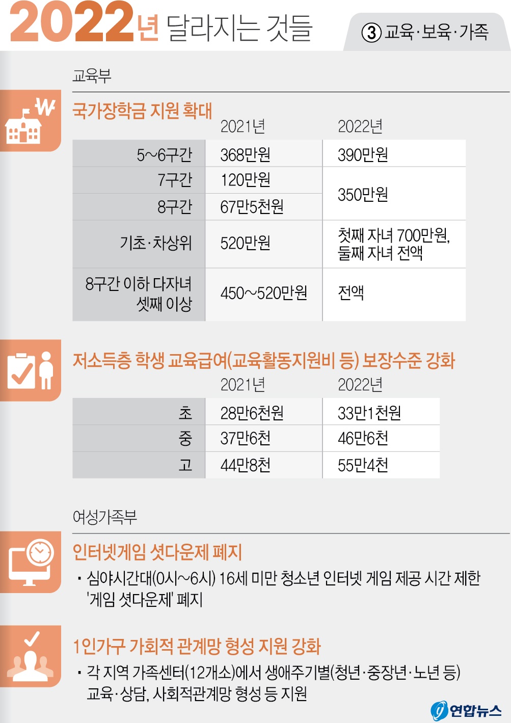 ▲ 맞벌이 학부모들의 돌봄 부담 경감을 위해 수요 및 시도별 여건에 따라 기존 17시까지였던 초등돌봄 운영시간을 19시까지 확대됩니다. 유치원도 돌봄 공백 최소화를 위해 방과 후 과정 참여 대상의 지속적인 확대를 추진해 약 1만1000여 학급이 운영된다고 합니다. 학생들의 입장에서는 ▲ 고교학점제 시행 근거가 담긴 초·중등교육법 개정안이 통과돼 ‘고교학점제가 3월 25일부터 시행됩니다. 정부에서는 고교학점제를 마치 교육혁명이나 하는것처럼 떠들고 있지만 교원단체나 교육관련 학자들은 교육을 더 황폐화시킬 것이라고 반대하고 있는 정책입니다.
