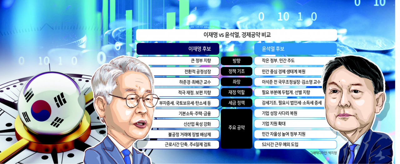 이재명후보는 ‘전환적 공정 성장’을 경제살리기 표어로 내걸고 정부가 디지털·에너지 등 신산업 전환을 이끌고 이 과정에서 발생하는 실직자 지원 등을 하겠다는 게 경제공약의 핵심이다. 이 후보는 디지털 전환에 올해 정부 예산의 5분의 1이 넘는 135조원(국비 85조원+민간 자금, 임기 5년 누적액 기준)을 투자하겠다고 했다. 수출 1조달러, 국민소득 5만달러, 종합 국력 세계 5강 달성이라는 목표치도 제시했다.