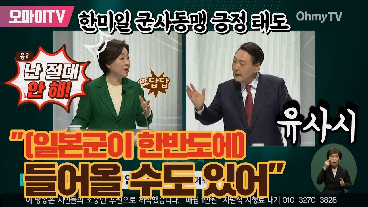 TV토론에서 윤후보는 "유사시에, 에? (일본 자위대가 한반도에) 들어올 수도 있는 거지만..." "우리와 일본 사이 군사동맹까지 가야되는지는, 아직 그런 상황까지 오지 않았기 때문에..."라면서도 "그러나 그걸(한미일 군사동맹을) 안 한다고 중국에 약속할 필요는 없지 않느냐"라고 했다. 당장의 필요성은 물음표이지만, 앞으로의 가능성까지 닫을 수 없다는 뜻이다. 윤석열후보의 횡설수설은 박근혜의 유체이탈 화법보다 듣기가 더더욱 짜증스럽다. 주관이 분명치 않다 보니 답변이라고 한다는게 횡설수설이 아니면 막말, 거짓말이다.