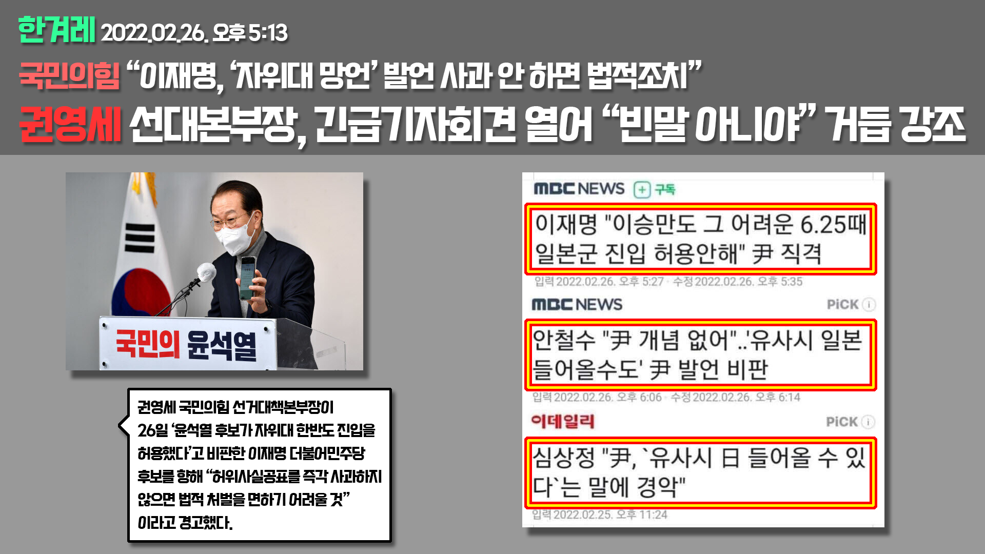 “유사시에 일본군 자위대가 한반도에 들어올 수도 있다”...? 지난 17일 윤석열국민의힘 대선후보는 "'킬체인(Kill-Chain)'이라고 불리는 선제타격 능력을 확보하겠다"는 발언의 충격이 채 가시기도 전에 이번에는 ‘유사시에 일본군의 자위대가 한반도에 들어올 수도 있다’는 발언으로 후폭풍이 거세다. 지난 25일 TV 토론회에서 윤석열후보의 ‘일본군 자위대’ 발언을 두고 더불어민주당 이재명후보는 “순국선열과 국민 앞에 사죄하라"고 촉구했다.