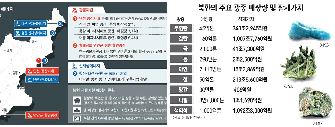 “우리의 소원은 통~일”... 생각만 해도 가슴 떨리는...통일....! 우리 헌법 전문에는 “대한민국의 영토는 한반도와 그 부속 도서로 한다고 했지만, 대한민국 영토 100,210km², 조선의 영토 120,540km² 두 나라를 합하면 220,750㎢다, 인구는 약 7000만명... 자본주의 안목으로 보면 조선 땅에 묻혀 있는 306가지 지하지원 철 금, 은, 석탄, 흑연 텅스텐...과 같은 중 유용광물 200여종 잠재가치만 해도 무려 7,000여조원이나 된다고 한다. 통일이 되면 새로운 일자리가 늘어나 취업자 수도 올라갈 수밖에 없다는 것은 상식이고...