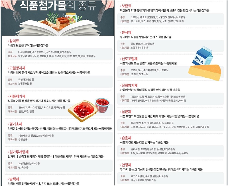 첨가물은 안전할까요? 식품의약안전처가 발표한 식품첨가물의 성분을 한번 살펴볼까요? 1. 방부제(소르빈산칼륨, 안식향나트륨, 벤조산나트륨, 살리실산, 데히드로초산나트륨)=식품 부패를 막고 장기간 보존하기 위해 사용하는 첨가물입니다. 이 방부제는 밀가루, 치즈, 초콜릿, 음료수, 과자, 자장면, 마가린, 빵, 어묵, 단무지, 햄 간장 등의 가공식품에 들어갑니다. 대부분의 가공식품에 방부제가 들어간다고 보면 틀리지 않습니다. 2. 감미료(아스파탐, 사카린, 아세설팜칼륨, 둘신, 나트륨)=설탕 대신 단맛을 내기 위한 식품첨가물로, 청량음료, 과자, 단무지, 빙과류, 요구르트에 사용됩니다. 3. 화학조미료=글루타민산나트륨으로 알려진 MSG다. 감칠맛을 내는 화학조미료로 라면, 자장면, 과자, 어묵, 통조림, 음료수, 맛소금에 쓰입니다. 4. 합성착색료(타르색소, 비타르색소, 녹색 3호, 적색 3호, 청색 1호, 황색 4호)=치즈, 버터, 아이스크림, 껌, 사탕, 소시지, 탄산음료에 쓰이며 색깔을 내는 역할을 합니다. 외식을 하면이 이런 첨가물을 들어 있다는 걸 알고 드시나요?...(계속)