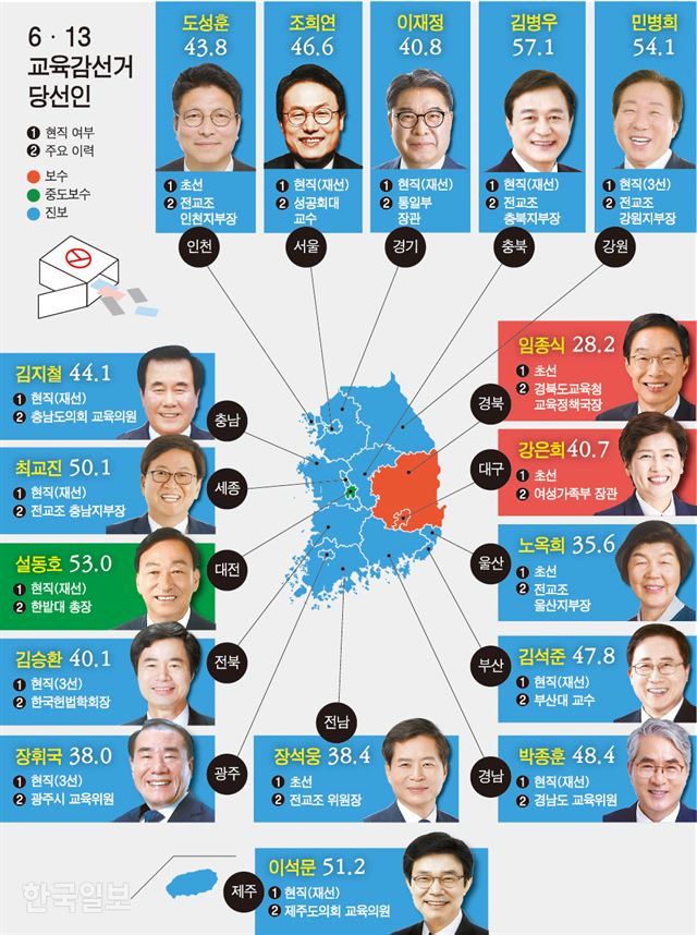 교육감후보는 지방교육자치법(24조) 때문에 정당소속일 수 없다. 그런데 빨강색은 마치 국민의힘, 파랑색은 더불어민주당을 상징해 득표에 후광을 얻기 위한 얄팍한 꼼수가 숨어 있기도 하지, 사실은 빨강색은 보수를... 파랑색은 진보라는 이미지를 강조하고 있다. 현재 대전·대구·경북 세 곳을 제외한 14개 시·도교육감이 진보 교육감으로 분류된다. 전국의 초·중·고등학교 1만 2000여 곳 중 1만 1000여 학교가 그들의 관할에 놓여 있으니, ‘진보 교육감 시대’라고 해도 과언이 아니다.