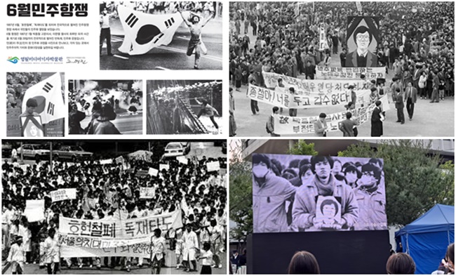 그러나 "군부정권은 백골단을 앞세워 청년·학생 시위대에 최루탄을 퍼부으며 몽둥이로 때리고 머리채를 휘어 잡아 감옥으로 끌고 갔다"고 했다. "이런 장인한 시위진압과정에서 이한열열사는 최루탄에 맞아 피를 흘리며 쓰러졌고, 끝내 사망하였다"했다. 그리고 그해 내내 전국에서 온 국민은 거리로 나와 저항을 이어갔다"면서 마침내 6월 29일 항복선언을 하였고 대한민국국민들은 대통령 직선제와 민주주의를 쟁취했다"고 했다.