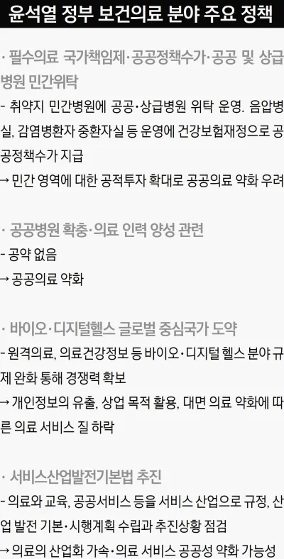 「윤석열 대통령의 후보 당시 공약집과 인수위 시절 보건·의료 국정과제를 보면, ‘필수의료 국가책임제’와 ‘공공정책 수가 도입’ 등 공공성 강화 항목들이 보인다. 하지만 내용을 살펴보면 민간병원에 공공정책 수가를 지급해 음압병실이나 응급실 설치·운영 등 공공보건 업무 참여를 유도하는 방식이다. 공공병원을 짓는 대신 민간병원에 공적자금(건강보험 재정)을 지급해 필수의료를 해결하겠다는 발상이다. 코로나19를 거치면서 시대적 과제가 된 ‘공공의료 확충’ 어젠다를 ‘되레 의료민영화의 발판으로 삼으려는’ 것(참여연대 윤석열 정부 국정과제 진단과 평가) 아니냐는 의구심을 낳는다.」