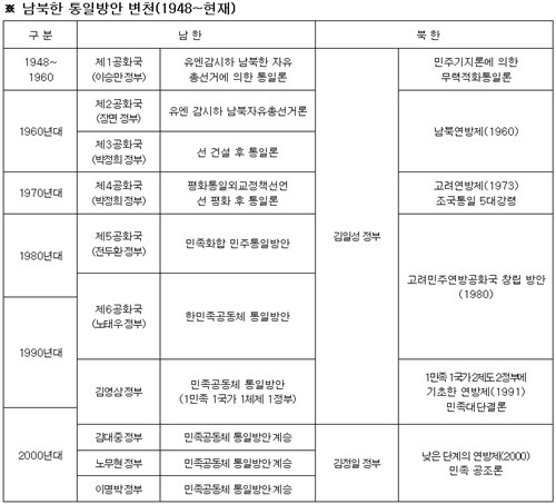 현재 남북간의 통일 방안을 보면 대한민국은 노태우정부와 김대중정부가 제안한 1민족 1국가 1체제의 ‘한민족공동체 민주통일 방안’과 김일성이 제안한1민족 1국가 2제도 2정부에 기초한 ‘고려민주연방공화국 창립방안’이 전부다.
