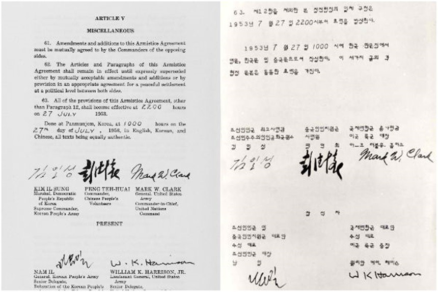 “국제연합군 총사령관을 一方으로 하고 조선인민군 최고사령관 및 중국 인민 지원군 사령관을 다른 一方으로 하는 下記의 서명자들은 쌍방에 막대한 고통과 유혈을 초래한 한국충돌을 정지시키기 위하여서 최후적인 평화적 해결이 달성될 때까지 한국에서의 적대행위와 일체 무장행동의 완전한 정지를 보장하는 정전을 확립할 목적으로 下記조항에 기재된 정전조건과 규정을 접수하며 또 그 제약과 통제를 받는데 각자 공동 상호 동의한다. 이 조건과 규정들의 의도는 순전히 군사적 성질에 속하는 것이며, 이는 오직 한국에서의 交戰 雙方에만 적용한다.” 조선인민군 최고 사령관 김일성원수와 중국인민지원군 사령원 팽덕희 그리고 국제연합총사령관 마크 클라크대장이 서명한 정전협정문이다.