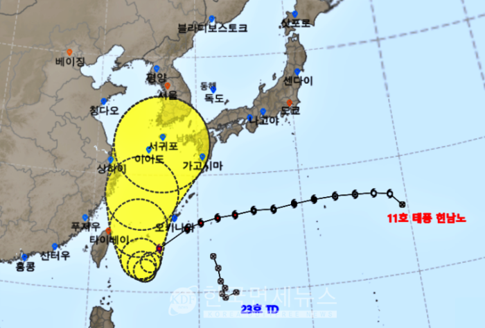 태풍 강도 중 가장 센 '초강력'으로 분류된 제11호 태풍 '힌남노'가 월요일 9시 제주도를 거쳐 화요일 새벽 2시, 오전 10시에는 부산을 거쳐 대한민국을 빠져나갈 것이라고 한다. 중심기압 920 헥토파스칼, 최대풍속 초속 54m, 강풍반경 400㎞로 매미의 강풍반경 330Km로, 전국이 영향권에 들어갈 것이라고 해 긴급대책회의가 초비상이다.
