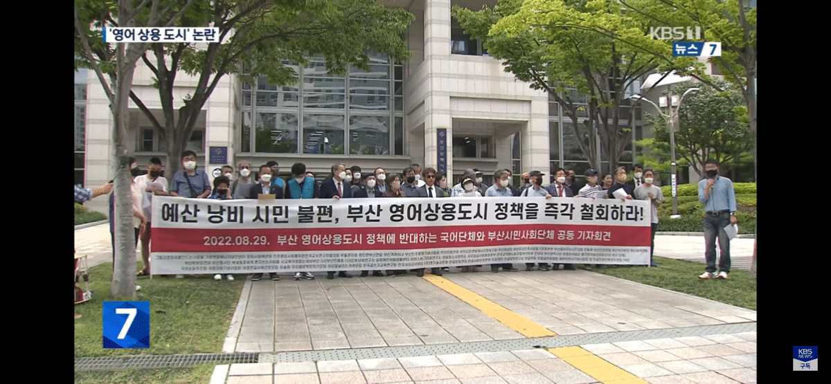 부산시의 영어 상용화 추진 소식에 반발 움직임도 본격화하기 시작했다. 한글학회와 세종대왕기념사업회, 한글문화연대, 외솔회 등 76개 한글단체와 부산 작가회의, 인본사회연구소, 우리말글사랑행동본부 등 34개 부산 지역 시민사회단체는 공동 기구를 만들어 반대 운동에 나섰다. 이들 단체는 "영어 상용도시는 인위적이고 무모한 실험"이라며 "경기도의 글로벌 빌리지와 같이 실패한 사례의 답습과 예산 낭비, 사교육비 부담 증가 등이 우려된다"고 주장했다.
