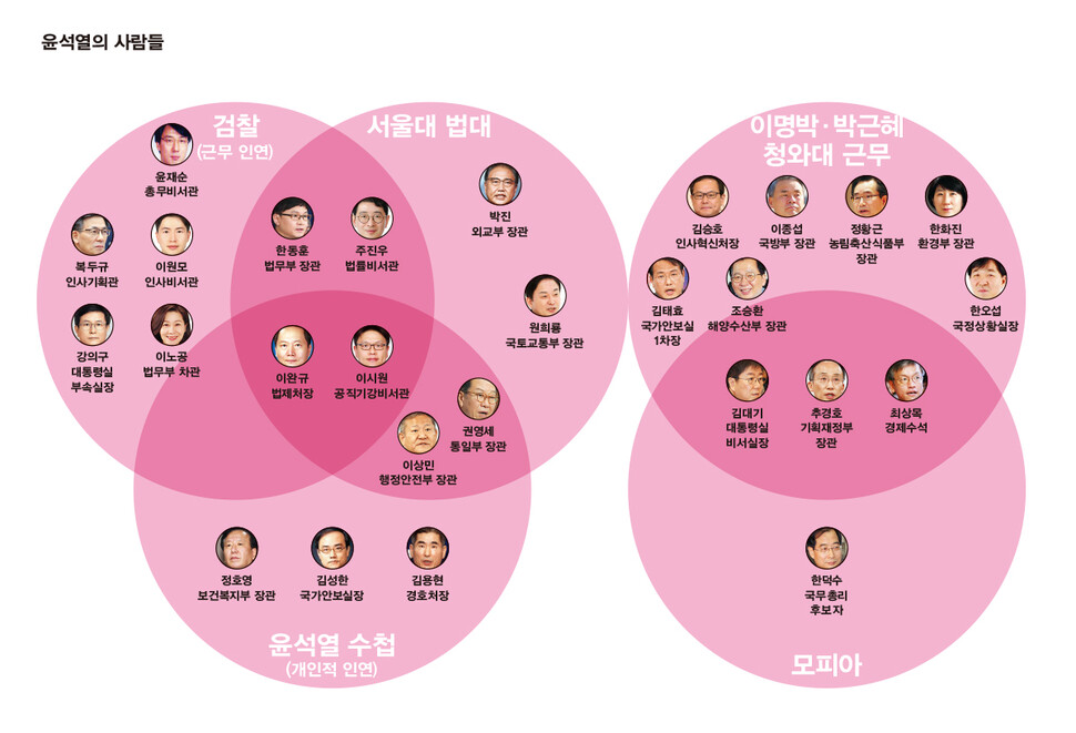 ‘검찰, 모피아(재정·금융 관료+마피아), MB(이명박 정부 출신), 서울대, 지인(가까운 사람), 남성…. 한겨레 21이 분석한 <윤석열 정부의 ‘인사 코드’ 여섯 가지>다. 윤대통령이 지명한 장·차관급과 대통령실 비서관의 얼굴의 모습이다. 법무부장차관, 법제 처장, 국가정보원 시회조정실장, 국무총리비서실장, 국가보훈처정, 순천지청장, 서울중앙지검장, 서울 북부지검 부장검사, 대통령실에는 총부미서관, 부속실장, 인사기회관, 인사비서관, 부속실장, 인사기획관, 인사비서관, 공직기강비서관, 법률비서관이 검찰출신이다. 비서관급 이상 40여 명 가운데 검찰 출신이 6명이다.