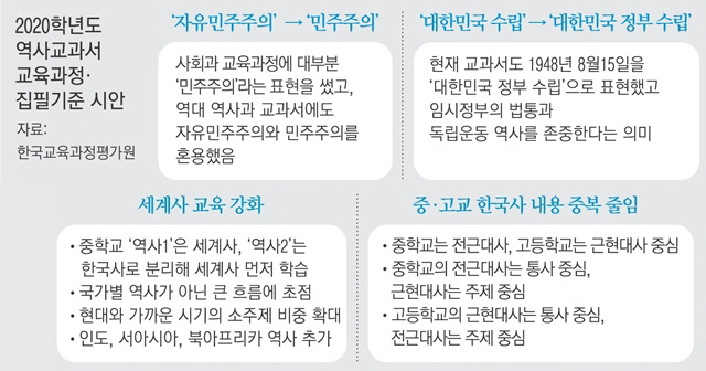 11월 9일 장상윤 교육부차관은 정부서울청사에서 '2022 개정 교육과정 행정예고' 기자회견에서 "고등학교 '한국사'와 중학교 '역사'의 현대사 영역에 '자유'의 가치를 반영한 '자유민주주의' 용어 수록이 필요하다는 의견이 지속해서 제기됐다"면서 "이에 교육과정심의회 등 논의를 거쳐 관련 표현(자유민주주의)을 반영했다"고 발표했다. 이에 따라 교육부는 역사 교육과정의 '성취기준 및 해설' 중 중학교 역사는 '사회 전반의 민주적 변화와 과제를~' → '사회 전반에 걸친 자유민주적 기본질서의 정착 과정과 과제를~', 고등학교 '한국사'는 대한민국 정부 수립 과정을 → 자유민주주의에 기초한 대한민국 정부 수립 과정을 민주화에 기반해 평화적 정권 교체가 정착되고 → 민주화에 기반해 자유민주적 기본질서에 입각한 평화적 정권 교체가 정착되고~로 바꿨다고 발표했다.