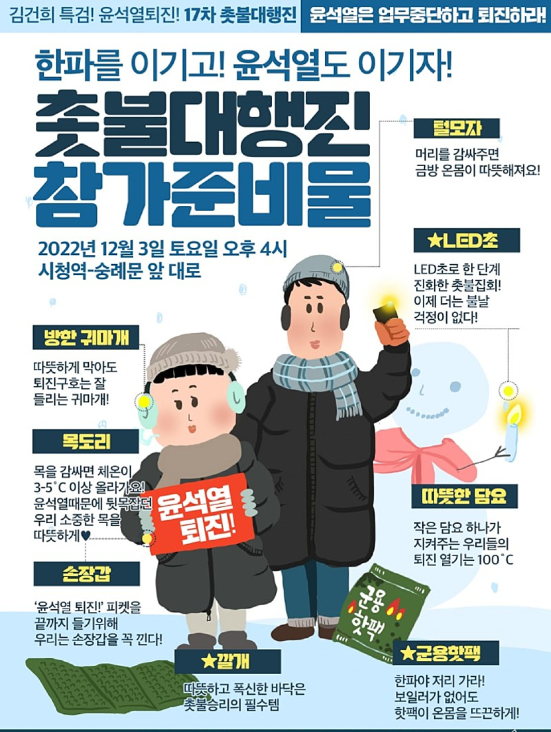 1948년 8월 15일 이승만정부 수립후 우리는 13명의 대통령이 나라를 운영했다. 그 13명 중 누가 진정으로 국민들을 주인으로 섬기는 민주공화국을 만들었는가? 3일(토요일) 윤석열 대통령의 퇴진과 부인 김건희 특검을 촉구하는 집회가 서울 시청역 인근에서 열린다. 2022 카타르월드컵 12년 만의 16강 진출에 함께 축하해야 할 시민들이 한파속에서도 예외 없이 오늘도 예외는 없다. 촛불행동은 “무책임과 무능을 넘어서 이제는 국민 위에 군림하며 검찰독재 정권의 본색을 드러내는 윤석열”이라며 “‘윤석열 퇴진 100만 범국민선언’으로 철면피, 파렴치한 윤석열을 심판하자”고 주장했다. 촛불행동에 따르면 윤 대통령 퇴진을 촉구하는 집회는 포항, 부안, 충북, 군산, 광주, 대전, 부산, 수원, 춘천, 대구, 제주도 등에서 각각 열린다.