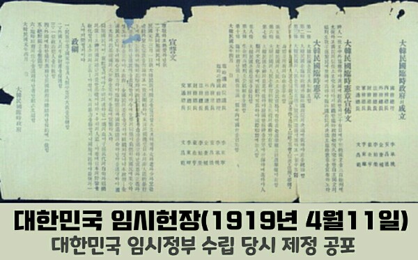 “제1조 대한민국은 민주공화제로 한다”(인시헌장 제 1조) 우리는 하도 많이 들어서 모르는 사람이 없는 이 헌법 조항은 나라를 잃은 국민, 그리고 군주국가인 나라에서 “대한민국의 인민은 남녀, 귀천 및 빈부의 계급이 없고 일체 평등하다.(임시헌장 제 3조)”조항을 꿈 같은 일이었다. "신인일치로 중외 협응하여 한성에서 기의한 지 30유여 일(有餘日)에 평화적 독립을 300여 주에 광복하고, 국민의 신임으로 완전히 다시 조직한 임시정부는 항구 완전한 자주독립의 복리로 아 자손 여민(黎民)에게 세전(世傳)키 위하여 임시의정원의 결의로 임시헌장을 선포하노라"..라고 공포한 임시헌장은 선포문과 선서문 그리고 본문 10조로 구성되어 있다.