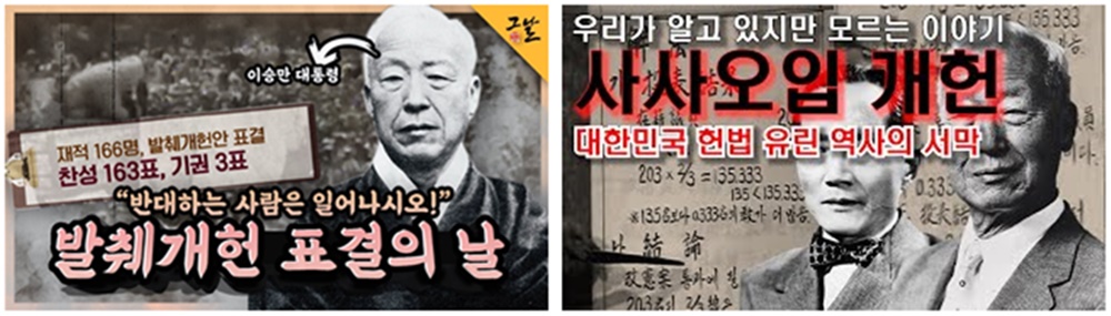 주권자인 국민이 아닌 대통령의 재선을 위해 제정된 헌법. 그것도 ‘피난국회’에서 ‘발췌개헌’으로 제정된 부끄러운 대한민국 헌법 유린의 역사가 시작된다. 이승만의 집권 야망은 그것으로 끝이 아니다. 1954년 5월 20일의 국회의원 선거에서 이승만 대통령이 이끄는 자유당이 다수를 차지하자, 정부는 9월 8일에 초대 대통령에 한하여 3선 제한을 철폐하는 내용을 포함한 개헌안을 제출한다.