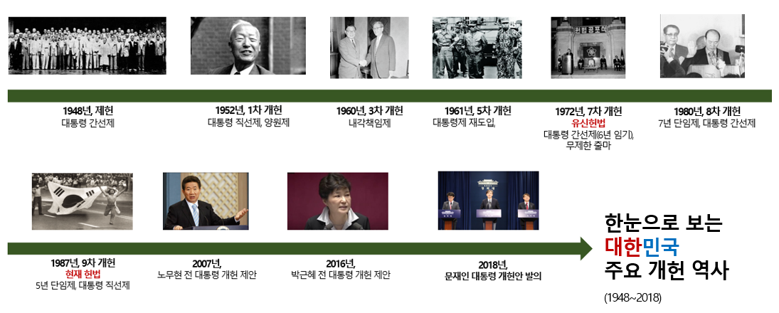 개헌의 역사는 굴절 많은 한국 정치사를 그대로 반영하고 있다. 총 9차례의 개헌 가운데 현직 대통령의 장기집권을 위한 개헌이 4차례, 쿠테타 이후 정권찬탈을 위한 개헌이 2차례였다. 민의를 반영한 개헌은 4.19 직후 2차례(3,4차 개헌)와 현행 헌법이 만들어진 87년이 전부다. 독재정권이 유린한 대한민국 헌법. 나라의 주인인 국민의 뜻에 따라 바뀌어여 할 헌법이 독재자들의 야망에 따라 휘둘린 헌법은 주권가 당한 폭력이었다.