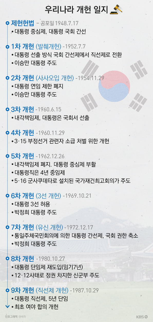 우리나라 헌법 제1조는 “대한민국은 민주공화국”이요, “대한민국의 주권은 국민에게 있고, 모든 권력은 국민으로부터 나온다.”고 했다. 헌법 제 1조를 풀이하면 대한민국은 ‘나라의 주인이 국민(민주주의)이요, 국민을 위해 정치를 하는 나라(공화국)’라는 뜻이다. 우리나라는 1948년 제헌헌법이 제정 된 수 아홉차례 개헌을 한다. 아홉례 중 419혁명 후 두 차례 그리고 6월 항쟁 후 한차례 그게 전부다. 역대 대통령은 나라의 주인인 국민은 안중에도 없고 장기집권을 위해 헌법을 유린한다.
