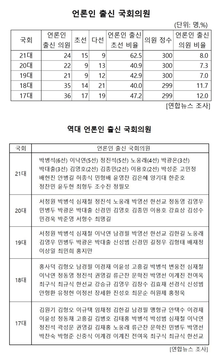 제헌국회부터 20대까지의 국회의원 가운데 언론인 출신은 모두 377명이다. 제헌국회 당시 20.5%를 시작으로 대체로 15% 전후를 유지하다가 16대 20.1%를 기점으로 감소세에 접어들어 19대와 20대에는 26명으로 8.7%에 달한다. 하지만 일본(2%), 미국(2.8%), 프랑스(1.2%) 독일(3.9%) 영국(5.4%) 등에 비하면 여전히 높다. 출신 언론사는 단일 단위로 봤을 때 동아일보와 조선일보가 가장 많았고, 절반 이상이 보수여당 계열로 진출했으며, 지역구보다는 경선을 치르지 않는 비례대표/전국구가 많았다. ..(계속)