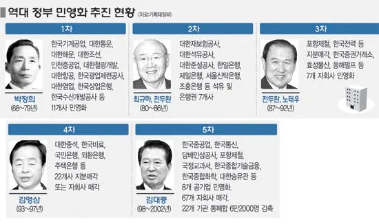 우리나라는 1960년대 후반부터 독점적 공기업의 경영부실과 비효율을 타파한다는 이유로 한국기계, 해운공사, 조선공사 등을 1968년에 민영화하였고, 그 이후부터 1973년까지 인천중공업, 대한항공, 광업제련, 워커힐호텔 등을 민영화하였다. 민영화 방식은 주식 매각과 시중은행의 현물출자형식 1981년∼1984년. 정부의 금융 산업 효율화를 위한다는 명분으로 한일은행, 제일은행, 서울신탁은행, 조흥은행 등 4대 은행이 민영화되었고, 1987년∼1997년. 1987년에 민영화추진위원회가 설치해 25개 정부투자기관과 5개 정부출자기관을 포함, 모두 30개 기관을 민영화 대상으로 선정하고 구체적인 민영화 일정을 마련했다.