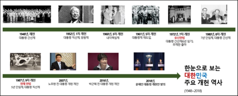 1차개헌 헌법은 한국전쟁 중인 1952년 7월 7일 부산 임시수도에서 이승만이 개헌한 헌법이다. 얼마나 다급했으면 전쟁중에 헌법을 바꿨을까? 내용은 놀랍게도 국민의 생명과 재산을 보호하기 위해서가 아니라 자신의 집권을 연장하기 위해 발췌개헌 헌법으로 불리워지는 ‘대통령 직선제, 양원제 국회(사실상 단원제), 국무원불신임제’가 주요 내용이다.