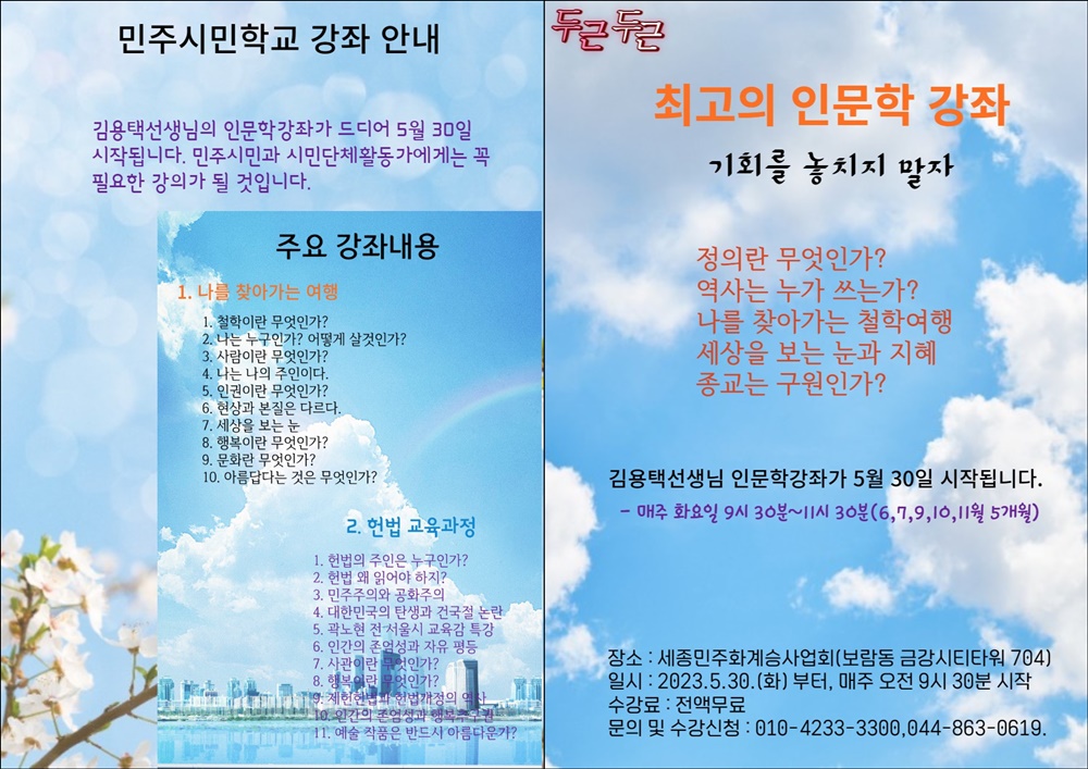 제가 고문을 맡고 있는 ‘세종민주화계승사업회’에서 ‘인문학 강좌’ 프로그램을 마련했습니다. ‘나를 찾아가는 여행’이라는 주제의 철학교육, 그리고 ‘헌법의 주인은 누구인가’라는 주제의 헌법강의를 2023년 전반기와 후반기로 나누어 준비했습니다. 낮시간이어서 학생들이 참여하기 어렵다는 안타까움이 남아 있지만 그 문제는 다음 기회로 미루고 우선 교육시민노동단체 회원들이 많이 참여했으면...하는 희망을 가지고 시작하려 합니다. 헌법읽기운동을 시작할 때처럼 많은 분들의 관심과 호응이 있기를 기대해 봅니다.