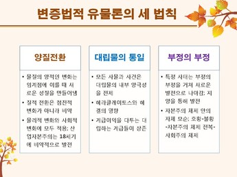 변증법은 사람의 눈에 보이는 모든 것은 “서로 연관되어 있고 변화한다”고 본다. ‘양질전화의 법칙’, ‘대립물의 통일과 투쟁의 법칙’, ‘부정의 부정의 법칙’을 변증법의 3대 법칙이라고 한다. 어떤 색깔의 안경을 끼고 세상을 보느냐에 따라 세상은 다른 색으로 보인다. 철학도 그렇다. 정신이 먼저라고 보는 관념론으로 보면 신이나 영혼을 믿는 사람도 있지만, 물질이 먼저라는 유물론으로 보면 세상은 자신의 뇌의 감각으로 인지되어 사물이 보인다고 생각한다.