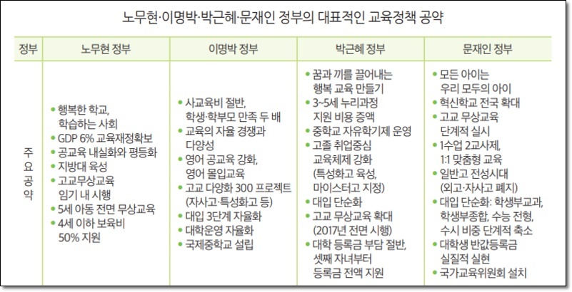 사교육문제가 정치문제에서 경제문제로 바뀌면서 2010 이명박정부는 ‘가난의 대물림을 교육으로 끊겠다’고 했다. 박근혜 대통령은 ‘자유학기제를 전면 도입하고, 학생들이 다양한 체험활동을 하며 스스로 재능과 끼를 찾아 도전할 수 있는 기회를 제공하겠다’고 했다. 문재인 대통령은 ‘기회는 평등하고, 과정은 공정하며, 결과는 정의로워야 한다고 했지만 문재인 정부에서는 사교육비가 오히려 역대 최대 규모로 올려놓았다.