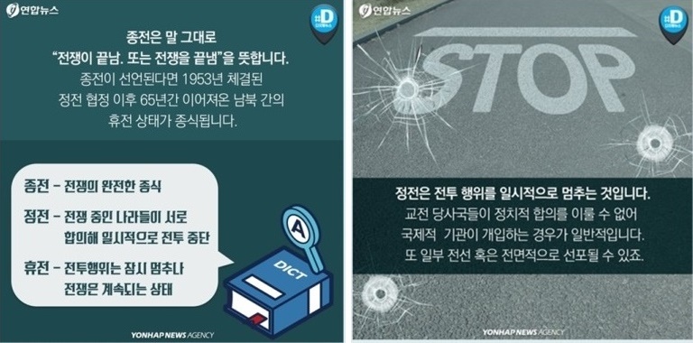 전쟁을 멈춘다는 것은 종전이어야 하지만 한반도에서 벌어진 6·25전쟁은 종전(終戰)이 아닌 휴전(休戰)이다. '휴전'은 국제법상 여전히 전쟁 상태를 의미하지만, 당사국 간의 협상을 통해 전투를 잠시 멈춘 상태를 말한다. 휴전(休戰)과 정전(停戰)은 다르다. 행정안전부 산하 국가기록원은 “‘정전(停戰)’은 휴전의 전제로서 짧은 기간의 적대 행위 중단을 의미하는 반면 ‘휴전(休戰)’은 전쟁의 중단을 의미하지만 전쟁원인의 해결에 합의하지 않은 채 전쟁을 종료한다는 뜻이라고 해석했다. 협정문 원문을 보면 ‘Armistice’ 휴전(休戰)이라고 명시하고 있는 반면, 한국어 번역본에는 ‘정전停戰)’이라고 했다.