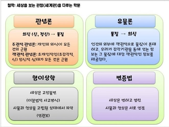 철학은 세상을 비춰주는 거울이다. 관념철학으로 세상울 보면 세계의 근원이 정신이라고 비춰주고 변증법적 유물론이라는 철학으로 보면 세상의 근원은 물질이라고 비춰준다. 변증법적 유물론은 모든 사물과 현상은 끊임없이 변화하고 발전하며, 이러한 변화와 발전은 서로 연관되어 있다는 이론이다.