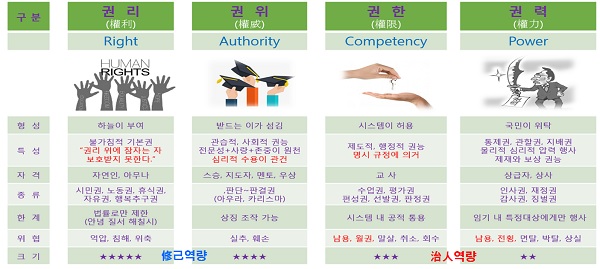 권력(權力), 권리(權利), 권위(權威)는 비슷한 말이다. 권력(權力, Power)이란 ‘자신의 의지나 결정을 상대방에 관철시켜 자신이 의도하는 대로 상대방의 태도나 행동을 변화시킬 수 있는 능력’이다. 권리(權利)란 ‘어떤 일을 주체적으로 자유롭게 처리하거나 타인에 대하여 당연히 주장하고 요구할 수 있는 자격이나 힘’이다. 권력과 비슷한 말 권위(權威, authority)는 ‘타인의 행동을 변화시킬 수 있는 능력’, ‘다른 사람에게 영향을 미치는 능력’이라는 점에서는 권력과 같다. 하지만 권위는 정당성과 사회적 인정이 필요하지만 ‘자신의 의사를 다른 사람에게 관철시키기 위해 강제나 위협을 사용하지 않는다.