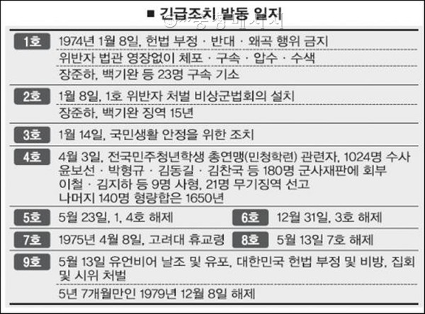 1975년 5월 13일자 발표된 긴급조치는 ‘학생의 정당한 이유 없는 출석, 수업, 또는 시험을 거부’하면 사형에 처할 수 있고 학교는 폐교시킬 수 있다’ 설마...! 하고 믿어지지 않겠지만 분명한 사실이다. 학생시절, 국사 시간에 긴급조치라는 걸 배웠지만 이 정도라는 사실을 기억하는 사람은 많지 않을 것이다. 박정희가 발표한 긴급조치는 유신헌법 제 53조가 명시한 대통령의 권한이다. 당시 긴급조치는 헌법의 상위법이었다.