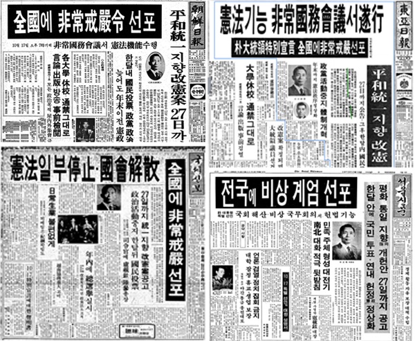 “대한민국 헌법을 부정, 반대, 왜곡 또는 비방하거나 개정 또는 폐지를 주장, 발의, 청원하는 행위, 유언비어를 날조, 유포하는 일체의 행위를 한 자는 법관의 영장 없이 체포, 구속, 압수, 수색하며 15년 이하의 징역에 처하고 이 경우에는 15년 이하의 자격정지를 병과할 수 있다”고 했다. 박정희가 발령했던 긴급조치권이다.