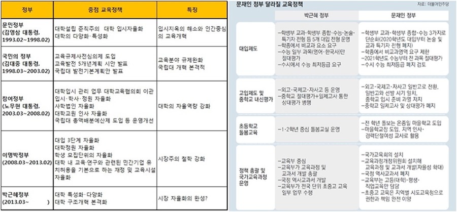 이명박 대통령이 추진했던 교육개혁의 핵심은 교육도 상품이라며 ‘대입 자율화, 수능 등급제 폐지, ‘학업성취도 평가, 영어 몰입교육, 자립형 사립고 설립 확대 등 교육시장화 정책이었다. 박근혜정부는 누리과정 완전무상교육, 사교육비 절감, 초등학교 '온종일 학교' 운영, 선행학습금지, 중학교 자유학기제 시행, 고교 무상교육 시행, 대입제도 간소화, 대학생 반값등록금 시행, 인성교육 우선 수업 강화, 꿈과 끼를 살려주는 교육과정 운영, 초등학교를 온종일 돌봄학교로 운영, 고등학교 무상교육 실시, 개인 맞춤형 진로설계 지원, 사교육비 경감 정책 추진, 교원의 행정업무 경감, 학교폭력 및 학생위험 제로(Zero) 환경 조성, 대학입시 간소화... 라는 공약을 내걸었다.