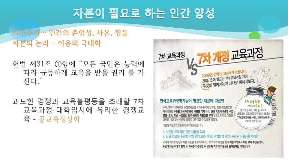 5.31 교육개혁안은 바로 신자유주의 논리에 바탕을 두고 있는 학교의 시장화 원리에 기초하고 있다. 교육의 시장화정책은 교사 개개인간의 경쟁을 유발하는 성과(업적)에 바탕을 둔 평가체제다. 대표적인 정책이 성과급제다. 학교를 ‘시장’으로 보고 학생을 ‘상품’으로 보는 신자유주의 교육관으로는 헌법 31조도 교육기본법 4조의 목적도 달성하지 못한다. 교육이란 개인적으로는 ’생존 방식을 습득하는 과정‘이요, 사회적인 존재로서 ’더불어 살아가는 지혜를 체득하는 과정‘이다.