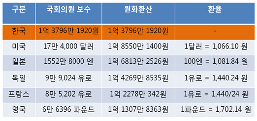 일본 국회의원의 월급은 100만엔 정도밖에 안된다. 코로나 사태 이전까지는 129만 4000엔(약1280만원) 이었으나 코로나 사태 이후 20% 가량 삭감돼 현재는 103만 2000엔(약 1020만원)이다. 미국 국회의원의 연봉은 17만4000달러(약 1억9540만원), 독일은 9만9024유로(약 1억4703만원), 프랑스는 8만5201.8유로(약 1억2651만원), 영국은 6만6396파운드(약 1억1309만원)의 연봉을 받는다. 이탄희의원은 국회의원 세비가 연 1억 5500만 원(월 평균 1285만 원)이라고 했지만 각종수당을 합하면 한해 2억3천48만610원을 받는 우리나라 국회의원의 세비와는 비교가 안된다.