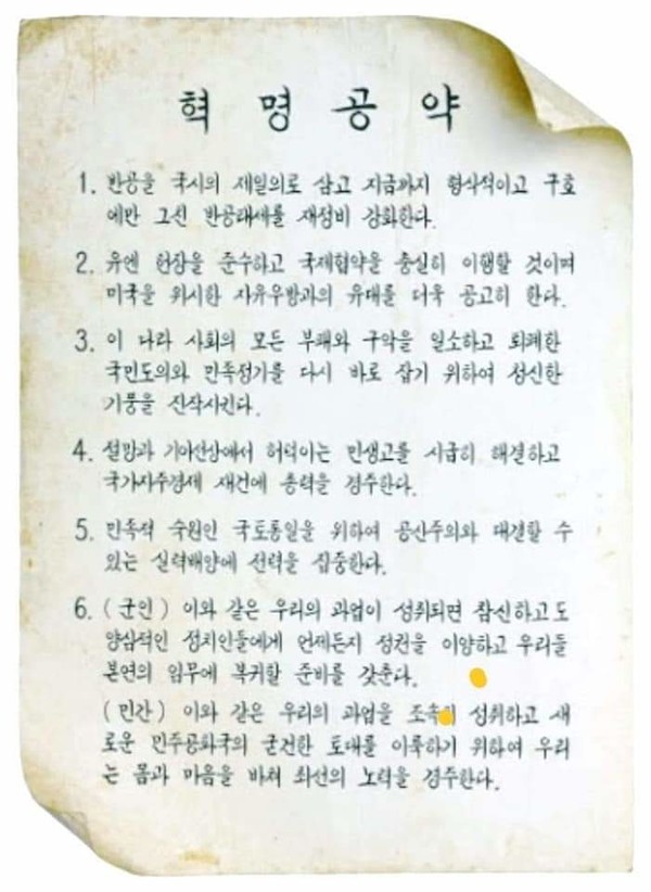 박정희를 비롯한 반란세력들은 ”반공을 국시의 제일의로 삼고 지금까지 형식적이고 구호에만 그친 반공태세를 재정비 강화한다... ”며 “군부가 궐기한 것은 부패하고 무능한 현 정권과 기성 정치인들에게 이 이상 더 국가와 민족의 운명을 맡겨둘 수 없다고 단정하고, 백척간두에서 방황하는 조국의 위기를 극복하기 위해...” 혁명을 일으켰다며 ‘군사혁명위원회 위원장 육군 중장 장도영’의 이름으로 ‘5·16 혁명공약’ 발표했다. 반란 세력들은 ‘국민교육헌장’을 만들어 공중파를 통해 귀가 아프게 들어야 했고 초등학교 학생들까지 외우지 않으면 하교시켜주지 않을 정도였다. 지금도 그 시대를 살았던 사람들은 혁명공약을 외우고 있는 사람이 많다.