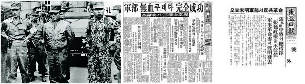 "오늘 아침 미명군부(미명 군부)서 반공혁명”...동아일보는 ‘신탁통치오보사건’ 주인공답게 “장도영 중장이 총지휘, 장면 정권을 불신임”...이라고 5·16을 ‘반공혁명’으로 호외를 발행했다. 조선일보는 “군부 무혈쿠데타 완전 성공”이라고 제목을 뽑고, 부제목은 “16일 하오부터 정식 시무, 혁명 완수에 만진”이라며 일제 강점기 “천황폐하만세!”를 불렀던 조선일보답게 썼다.